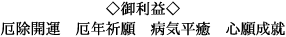 そのお姿は非常に恐ろしいオドロオドロとした憤怒降魔のお姿で、人を食らう夜叉の姿にして、悪人を食らい善人を食らわないと云われ、殊に経典には、清浄なる紐にて本尊青面金剛王に願いを込めて結べば、一切の善人衆生のあらゆる病難・苦難を封じ込め、または、婦人にあっては婦人病・下の病・夫婦和合・恋愛成就などの一切の願いを成就させるとの霊験が顕著であるとされ、その昔は女人庚申信仰が盛んであったとされています。