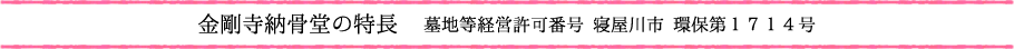 金剛寺納骨堂は、寝屋川市の納骨堂認可(墓地等経営許可番号 寝屋川市 環保第1714号)承認済みで、大阪府下では大変稀有な寺院納骨堂です。